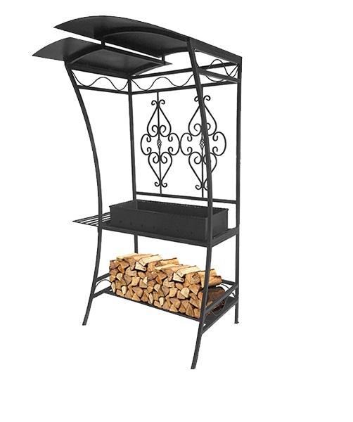 Помимо самого мангала, изделие оборудовано столиком для приготовления и размещения пищи. Внизу имеется специальная дровница для удобства хранения поленьев.