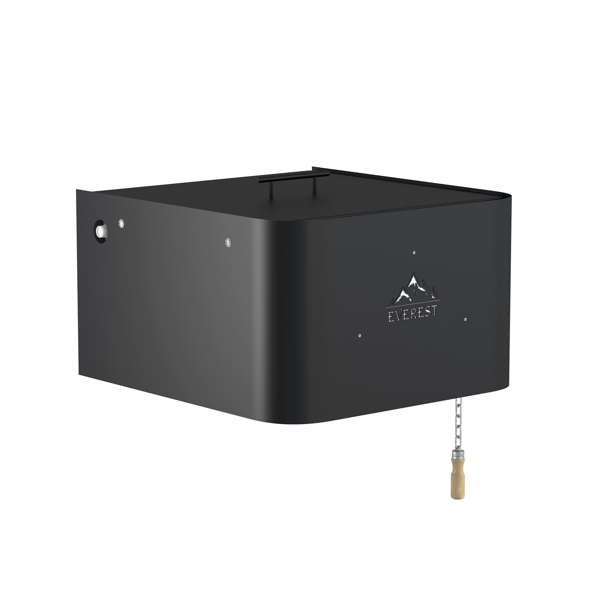 Обливное устройство ЭВЕРЕСТ представляет собой бак из нержавеющей стали, автоматически наполняемый водой. Количество воды в баке регулируется с помощью клапана подачи воды. Максимальный объём воды в баке – 15 литров. Бак обливного устройства устанавливается на высоте 2-2,2 метра. Вода для облива после парилки подаётся с помощью рукоятки на цепи. Широкое основание бака с большим количеством мелких отверстий обеспечивает оптимальный по размеру и интенсивности поток воды. Равномерная подача большого объёма воды обеспечена за счёт трех выпускных клапанов, одновременно открывающихся при потягивании рукоятки вниз.