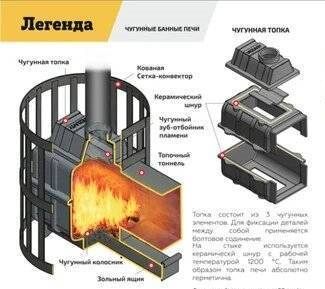 Преимущество печи в том, что топка печи состоит из 3-х элементов. На стыке между ними используется керамический шнур с рабочей температурой 1200 градусов. То есть топка печи абсолютно герметична! Для фиксации деталей между собой применяется болтовое соединение, что даёт 100% гарантию безопасности при эксплуатации.