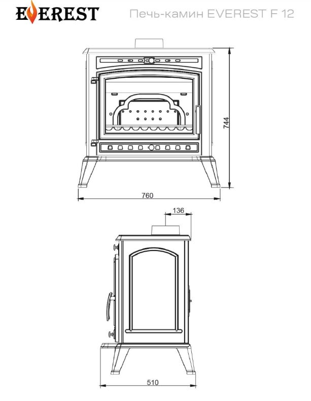 Печь-камин EVEREST F12 имеет классический стиль, она подойдет и украсит любой интерьер. Печь отлита из жаропрочного чугуна высокого качества, не требует дополнительного фундамента для нее . Имеет удобную дверь для закладки дров , хороший обзор на пламя через стекло. Подача воздуха в топочную камеру осуществляется с помощью заслонки, что позволяет регулировать режим горения. Также имеется двойной дожиг повышающий КПД печи, и минимизируюший остатки продуктов горения.