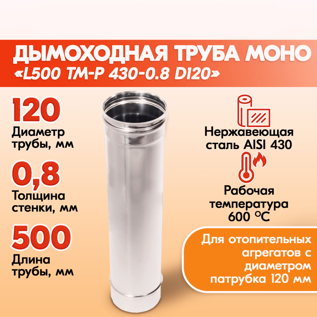 Трубы для дымохода из нержавейки L500 ТМ-Р 430-0.8 D120 для бани, газовый дымоход для котла и печная труба для отопительной печи и камина